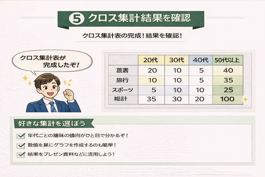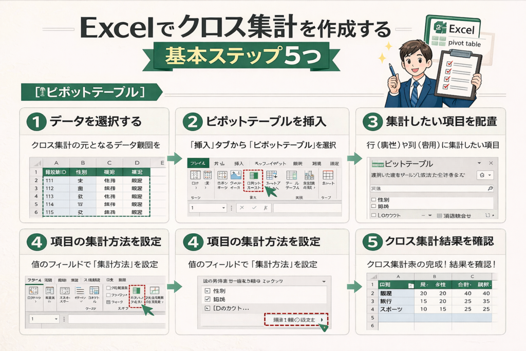 この5ステップを押さえれば、Excelでのクロス集計は一気に現実的な武器になります。