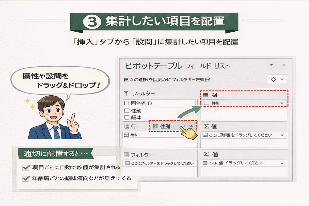 たとえば、行に年代、列に満足度を置くことで、年代別に評価の分布が一目で分かる表が完成します。