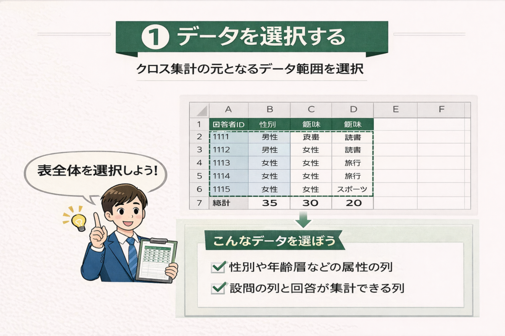 次は、そのクロス集計をExcelでどう作るか、具体的な手順に入っていきましょう。