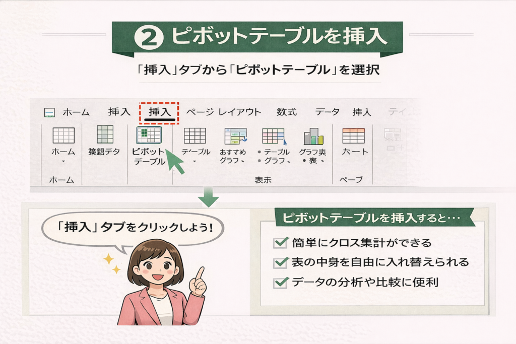 ローデータを選択したら、Excelの「挿入」タブから「ピボットテーブル」を選びます。