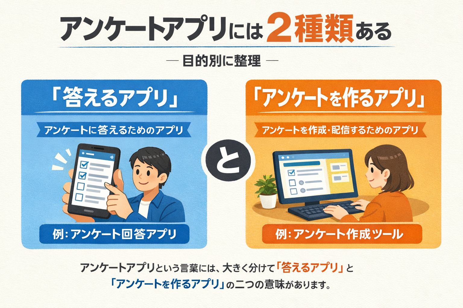 アンケートアプリという言葉には、大きく分けて『答えるアプリ』と『アンケートを作るアプリ』の二つの意味があります。