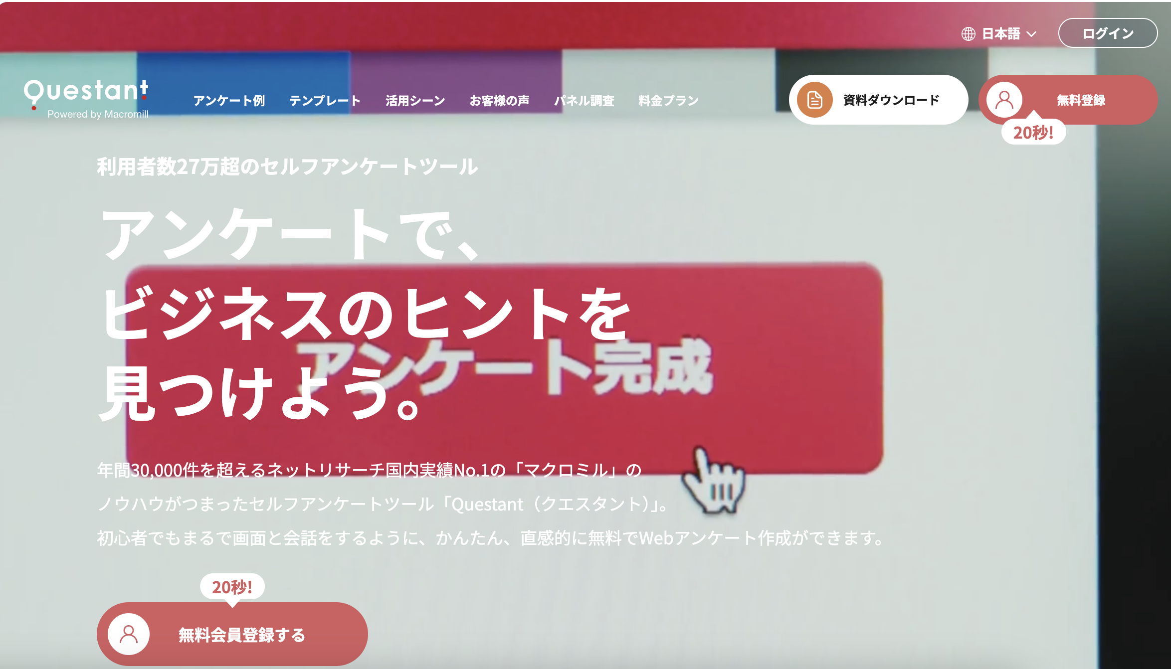 Questantは、リサーチ領域に強いネットリサーチ会社が提供するアンケート作成ツールです。テンプレートが70種類以上あるため、設問設計に不慣れでも調査目的に合ったフォーマットを選べる点が強みです。