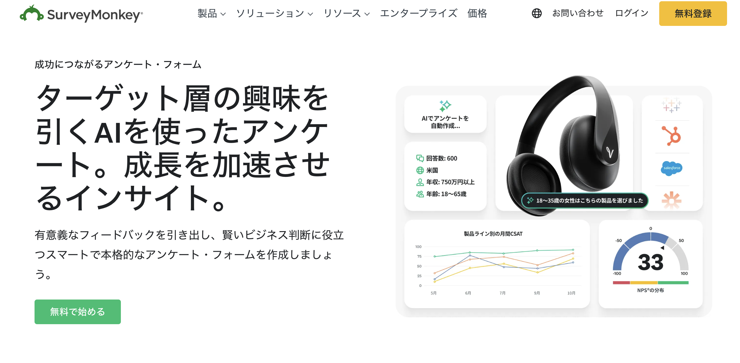 SurveyMonkeyは、長年アンケートツールとして実績のあるプラットフォームで、特に分析機能の強さが特徴です。質問テンプレートやサンプルも豊富で、特定の調査設計に悩まず進めたいケースにも向いています。