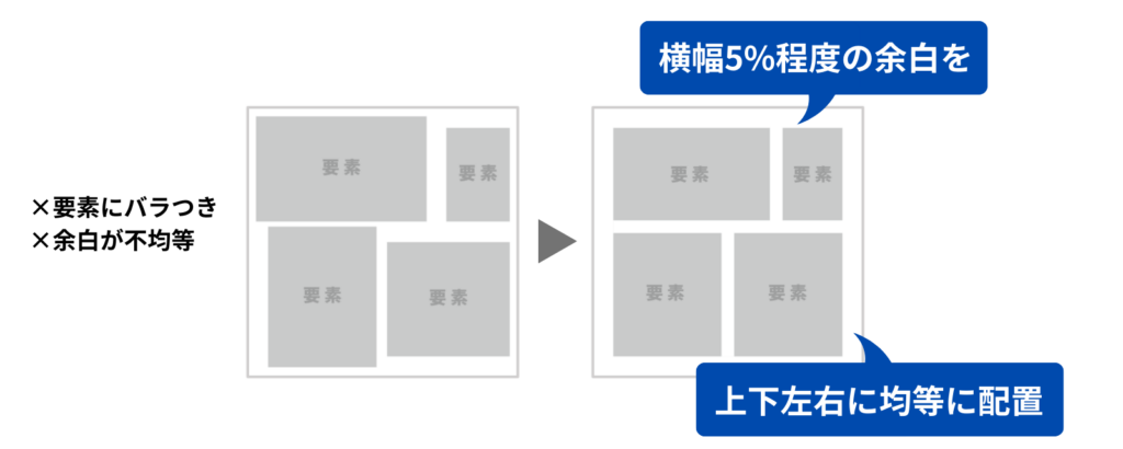 余白を十分に取り、情報のグループ化や見出しの統一で視線誘導を意識しましょう。
