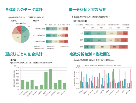 例えば下記のように全体の割合を測る際には『円グラフと棒グラフ』、分析軸が1つのものに対して回答が複数ある場合は『単一分析軸×複数回答』、分析軸が複数あるものに対して複数回答が存在している場合などなど。