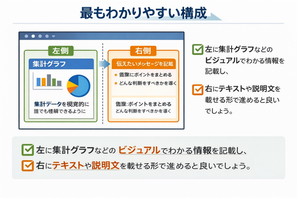 最もわかりやすい構成ではいえば、左に集計グラフなどのビジュアルでわかる情報を記載し、右側にテキストや説明文を載せる形で進めるのが良いでしょう。